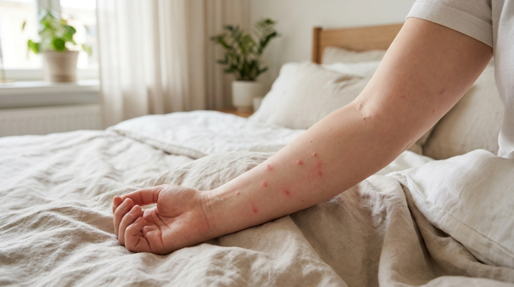 Un autre élément différenciateur est la présence de signes spécifiques d’infestation punaises de lit autour du lit, comme des traces de sang sur les draps, des points noirs (excréments) ou des œufs. Cela aide à confirmer l’origine des boutons.